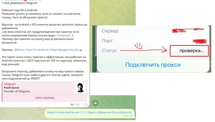 В Telegram есть старая уязвимость, которая позволяет раскрыть IP-адрес пользователя в один клик. Злоумышленник создаёт свой MTProxy-сервер, маскирует ссылку на него под обычный username или текст с помощью гиперссылки (t.me/proxy?...). Когда жертва кликает, Telegram автоматически проверяет прокси на работоспособность и отправляет пакет на сервер — владелец видит реальный IP без каких-либо предупреждений.