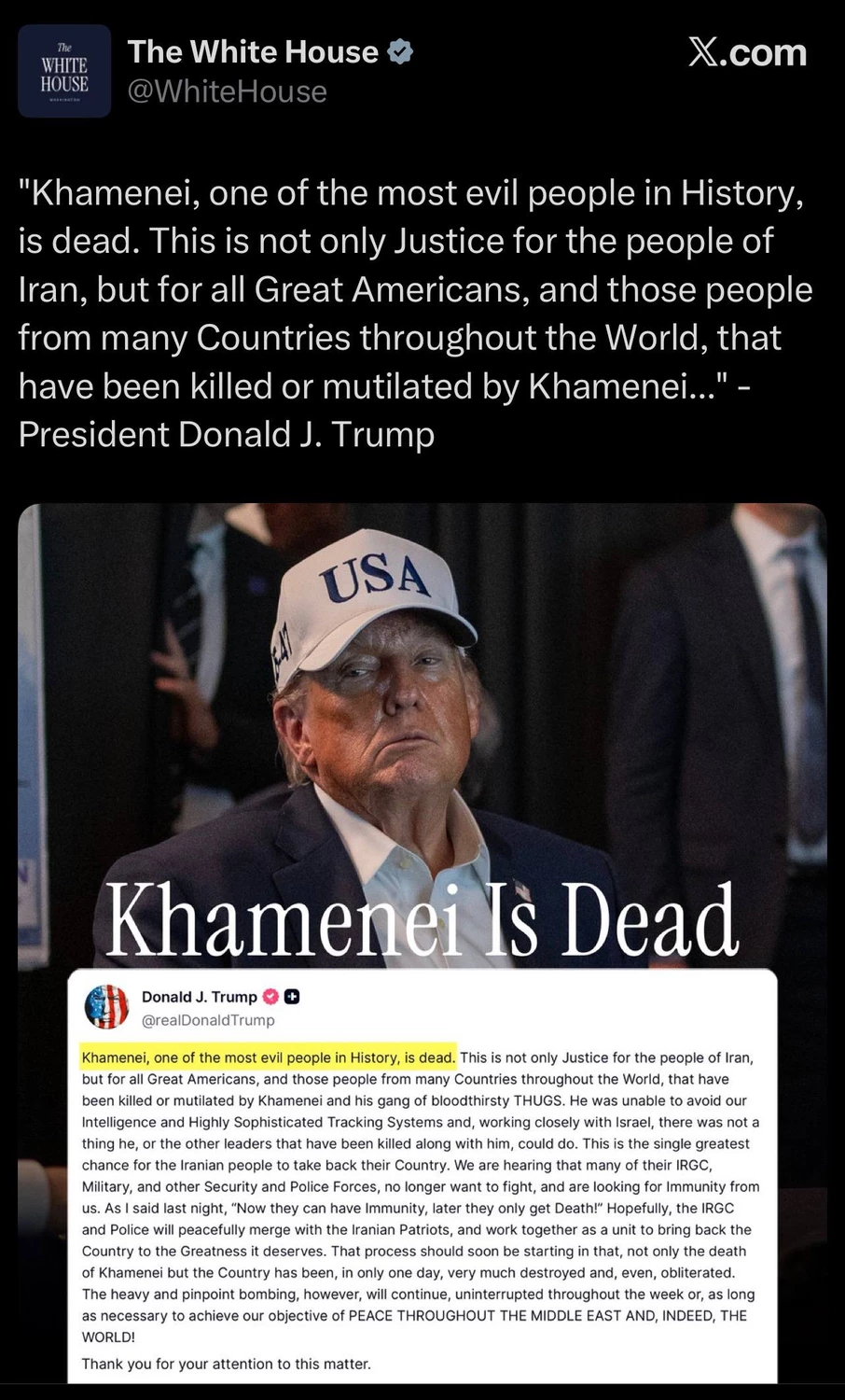 Дональд Трамп в своём посте заявил, что Хаменеи «мёртв», назвал это «справедливостью для народа Ирана и всего мира» и подчеркнул, что операция проведена разведкой США совместно с Израилем. Иран официально объявил 40 дней траура, а вероятность прекращения огня до 15 марта сейчас оценивают в 52% (по данным Bloomberg и аналитиков Polymarket).