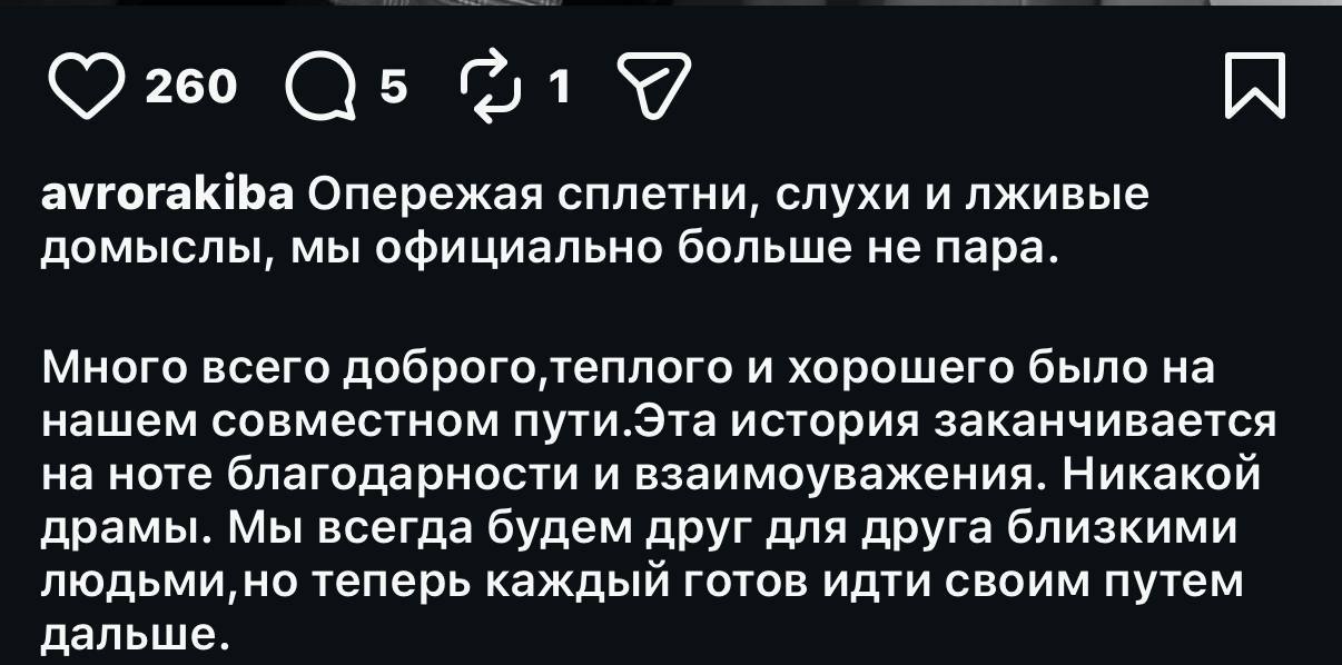 «Опережая сплетни, слухи и лживые домыслы, мы официально больше не пара. Много всего доброго, теплого и хорошего было на нашем совместном пути. Эта история заканчивается на ноте благодарности и взаимоуважения. Никакой драмы. Мы всегда будем друг для друга близкими людьми, но теперь каждый готов идти своим путем дальше», — так Аврора подвела черту. Лепс пока молчит, но близкие говорят, что он принял решение спокойно. Фанаты в шоке: всего месяц назад всё выглядело идеально, а теперь — разрыв. Любовь не выдержала — и это уже официально.