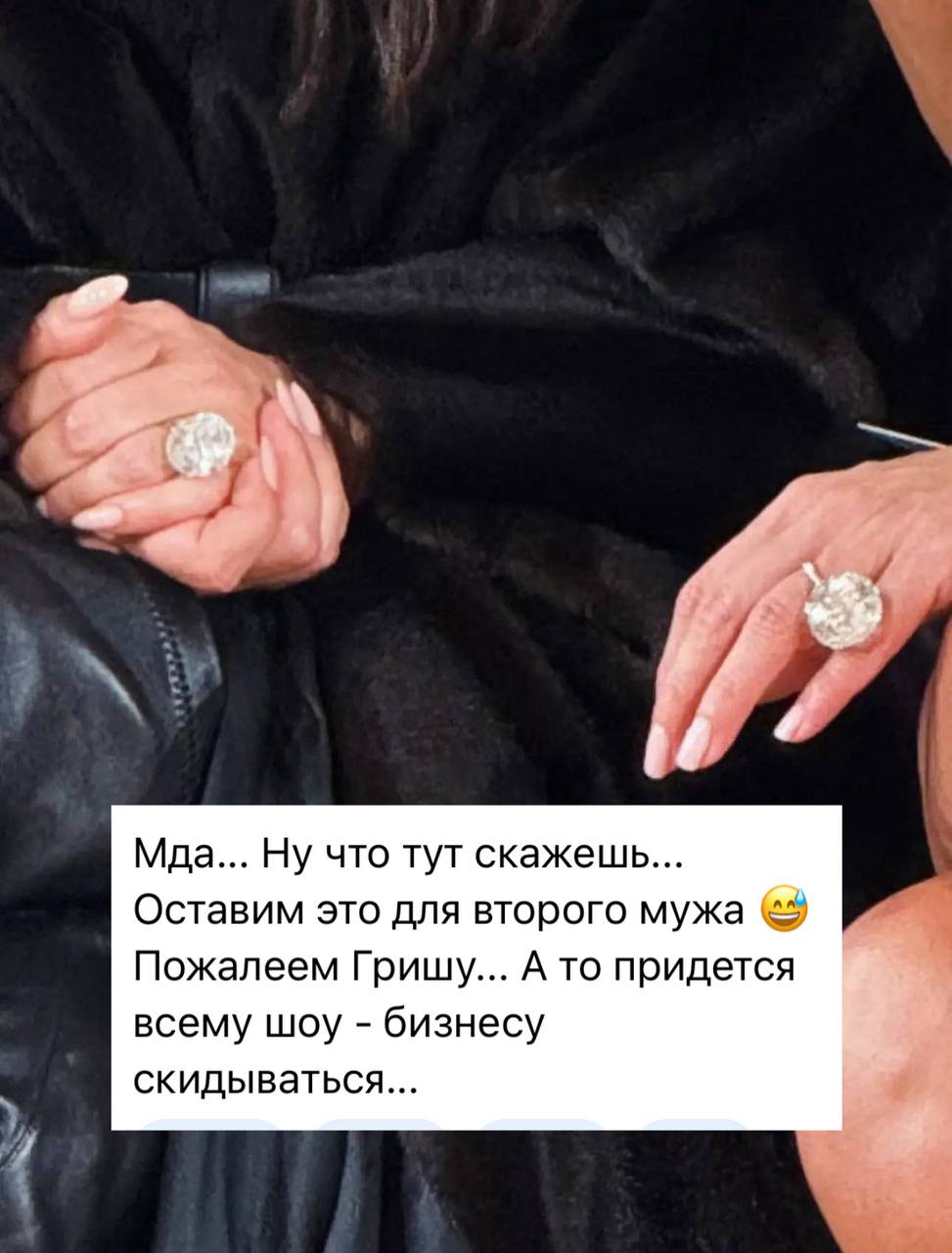 «Общая стоимость их колец оценивается приблизительно в 12 миллионов долларов. М-да... Ну, что тут скажешь... Оставим это для второго мужа. Пожалеем Гришу, а то придётся всему шоу-бизнесу скидываться», — подписала Аврора.