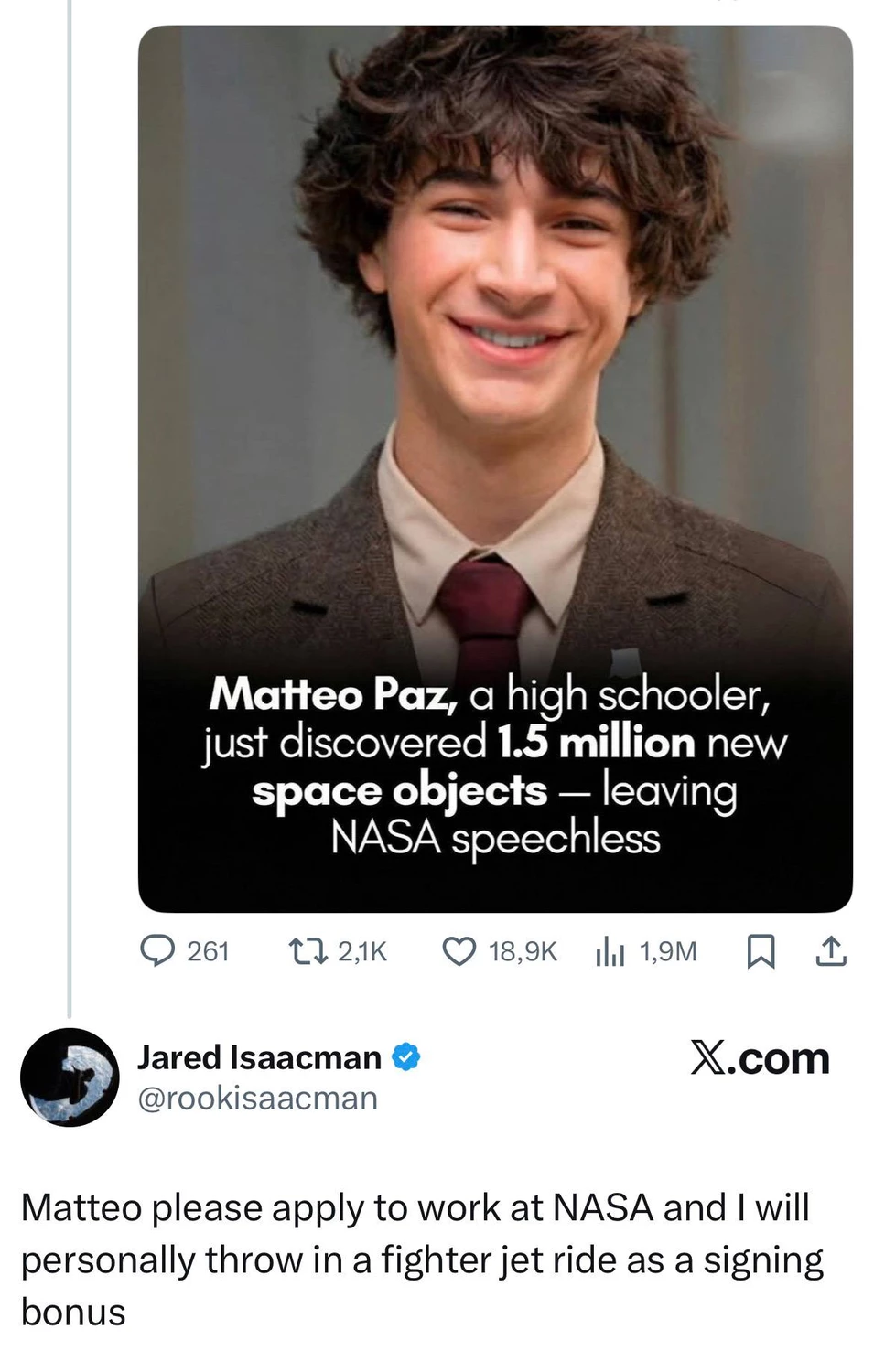 В США школьник нашёл 1,5 миллиона новых объектов в космосе — и глава NASA предложил ему работу прямо под постом @rookisaacman в X.