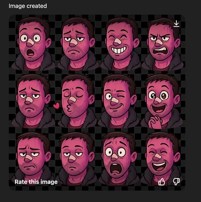 На основе моего фото и внешности создай набор из 12 стикеров в мультяшном стиле. На каждом стикере должна быть разная эмоция. Эмоции: удивление, разочарование, радость, гнев, печаль, поцелуй, подмигивание (кокетливость), восхищение, отвращение, скука, ужас, веселье. Эмоции должны быть выразительными. Сделай стикеры на прозрачном фоне, чтобы каждый стикер был с четким контуром и еще легко было вставить в мессенджер. Все стикеры должны быть аккуратно скомпонованы и не выходить за края.