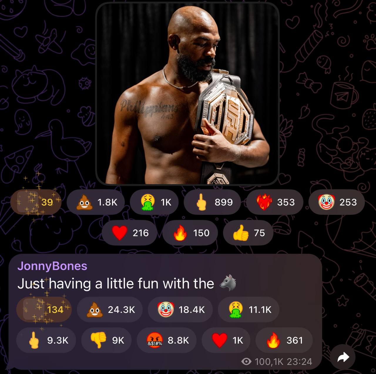 Похоже, что Телеграм снова запускает свою любимую «цепочку подарков» от звёзд. Джон Джонс в своём X-аккаунте намекнул на подарки в Telegram и прямо отметил Павла Дурова. И, как обычно, Дуров не заставил ждать — моментально отправил ссылку на официальный Telegram-канал Джонса.