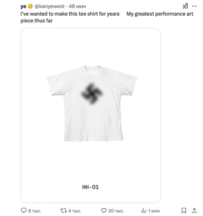 Канье Уэст продолжает шокировать общественность: он планирует выпустить футболку со свастикой, о чем сам заявил, что мечтал долгие годы. Певец считает этот принт «лучшим творческим перфомансом на данный момент». Дизайнер Гоша Рубчинский уже заявил о завершении сотрудничества с Yeezy
