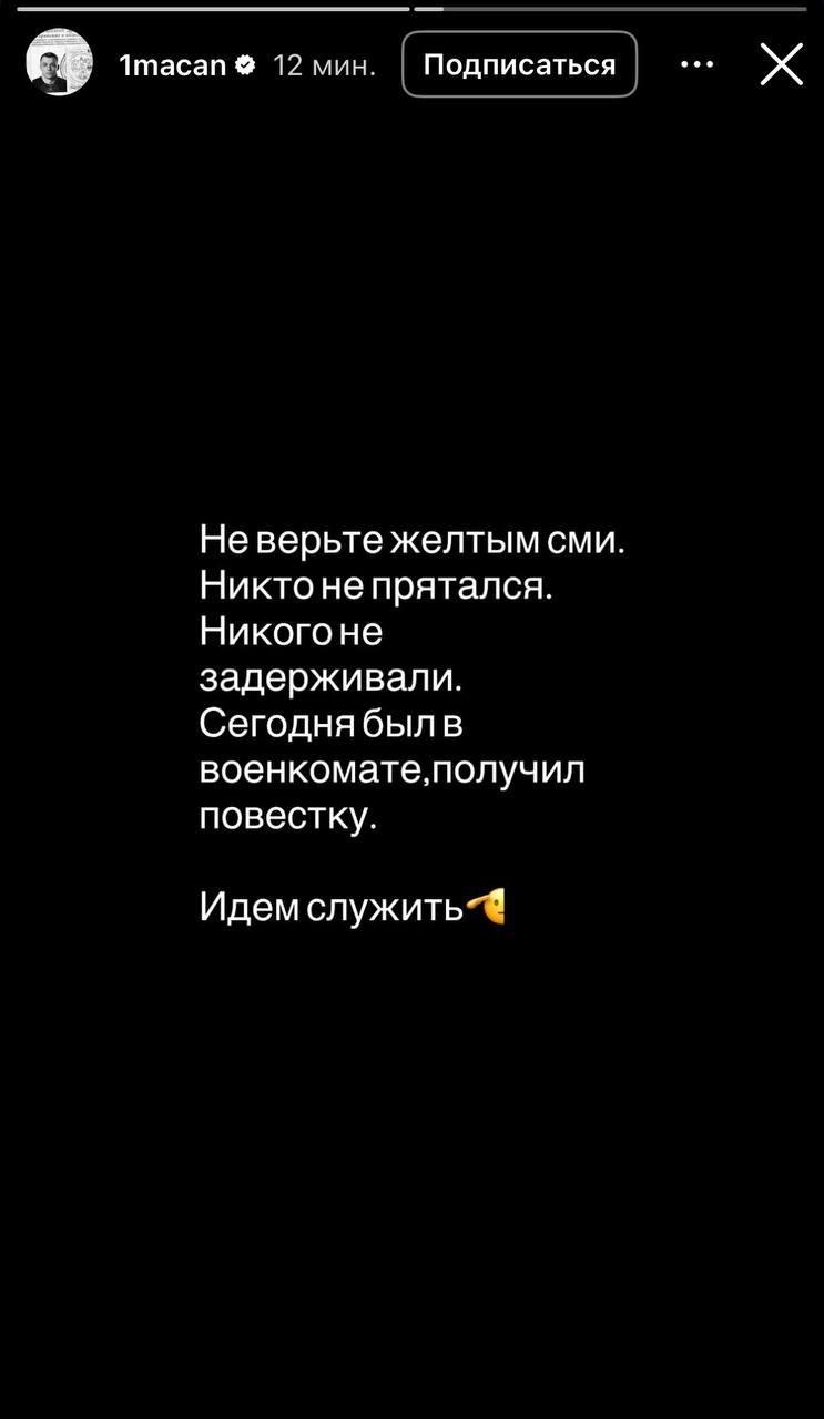 Макан заявил, что он сам пришёл и намерен отслужить в армии, опровергнув информацию о задержании. Однако ранее в СМИ появлялась информация о том, что рэпера всё-таки задержали и доставили в военкомат.