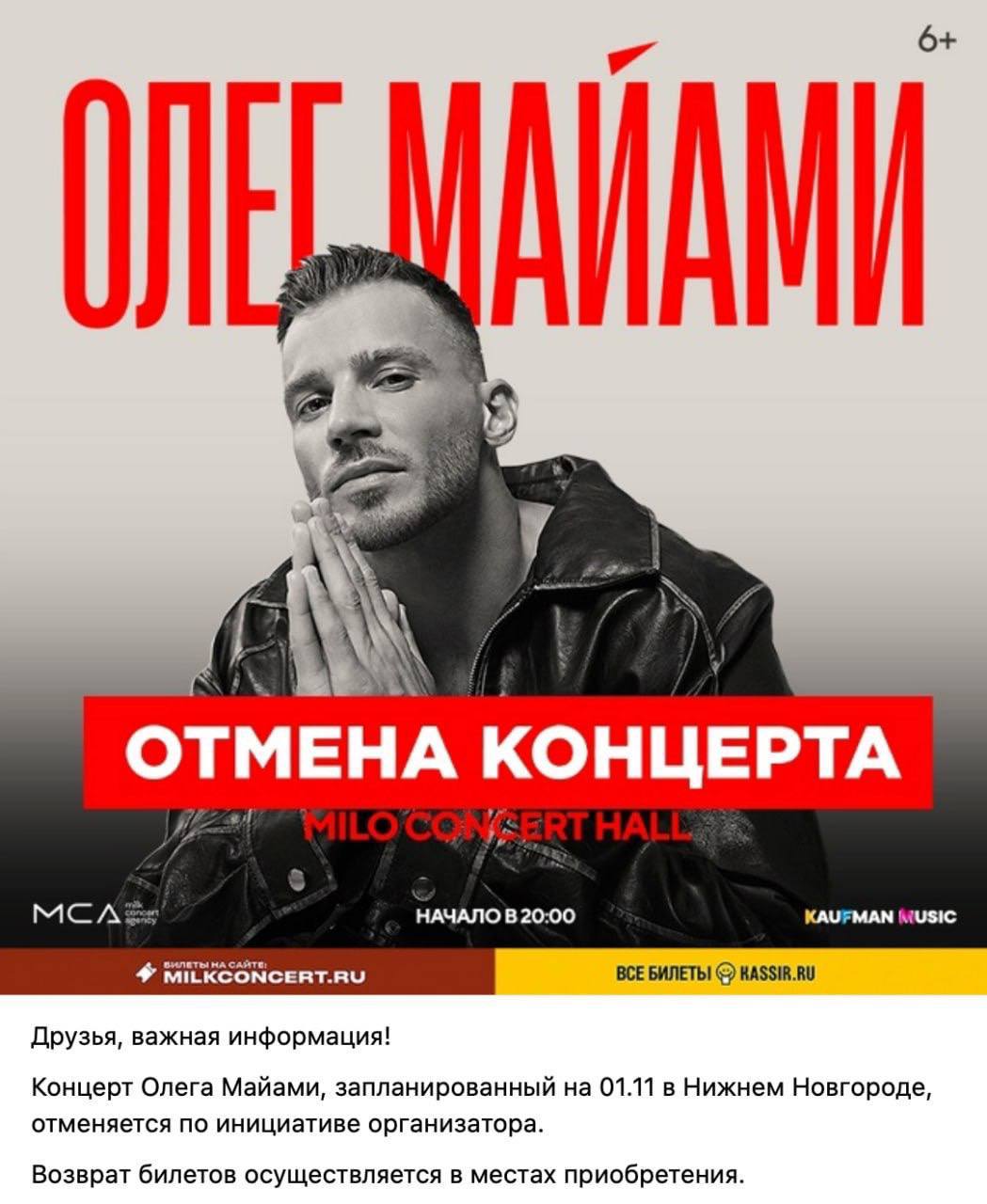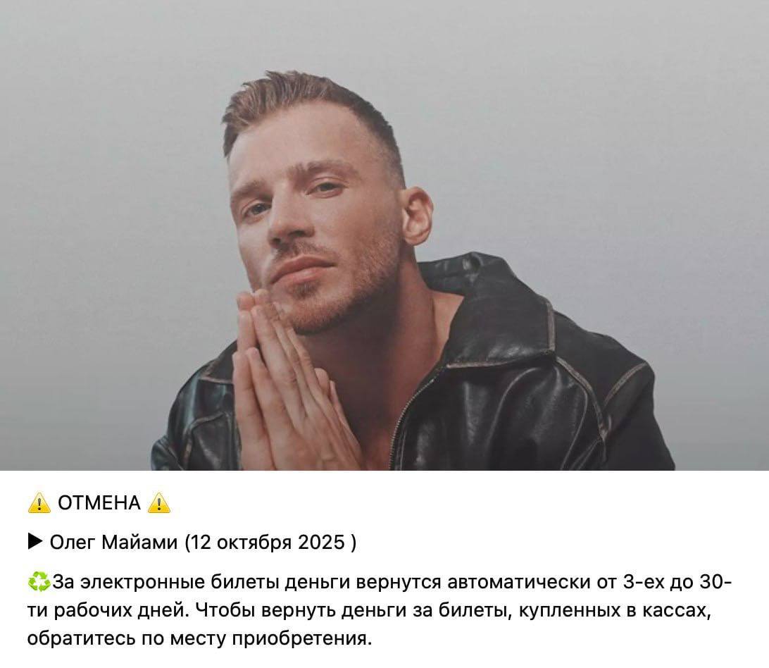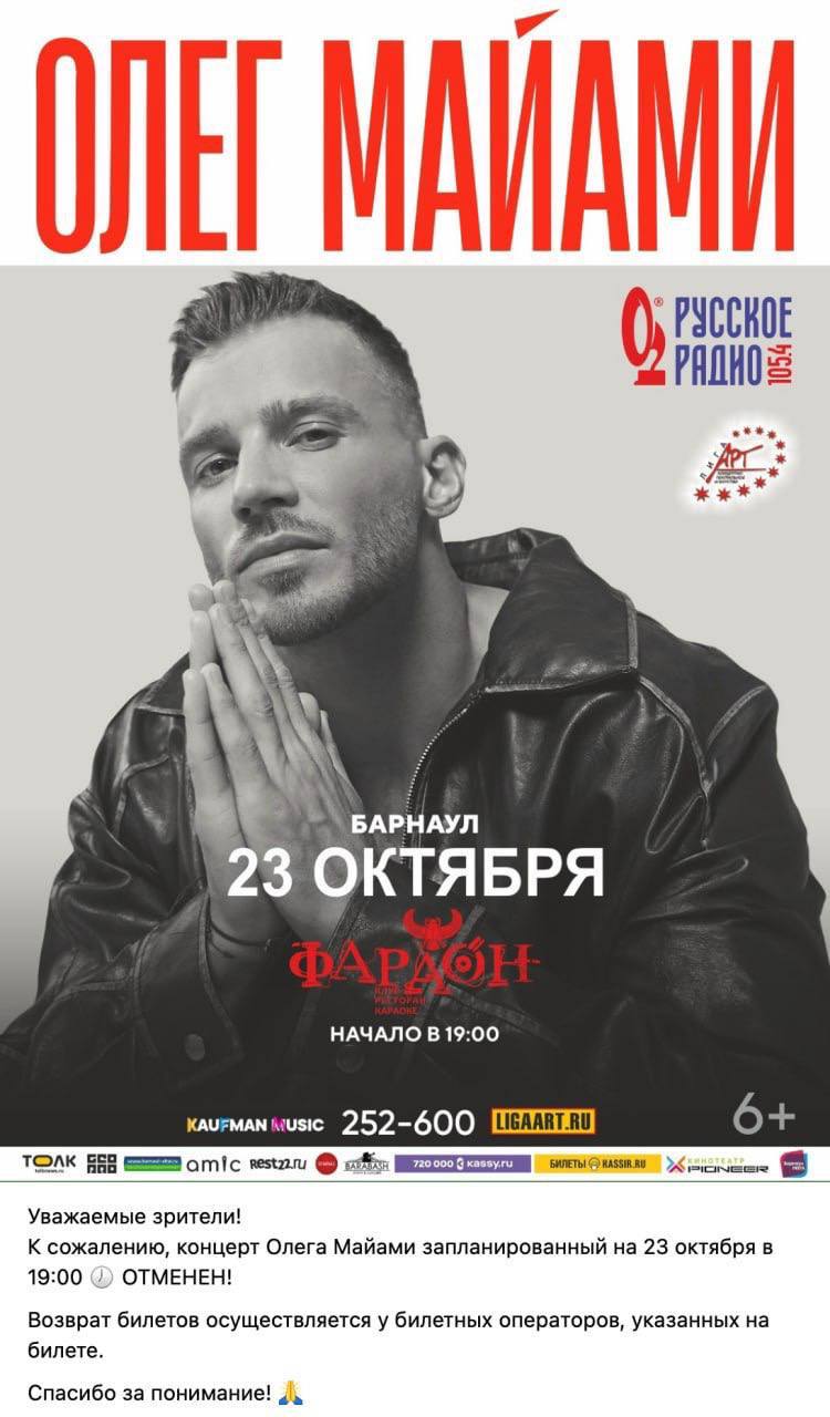 Олег Майами отменил свой тур по России, так как не смог собрать достаточное количество зрителей, сообщили СМИ. Изначально музыканту не нравилась идея турне, и он только под нажимом согласился на неё.