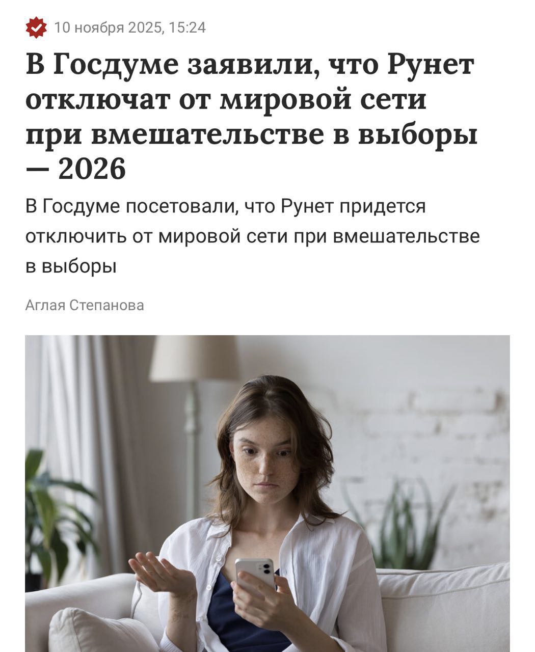 В Госдуме предупредили о возможном отключении Рунета от мировой сети в случае вмешательства в выборы 2026 года. Правительство наделило Роскомнадзор полномочиями отключать интернет в России при "угрозе нарушения информационной безопасности".
