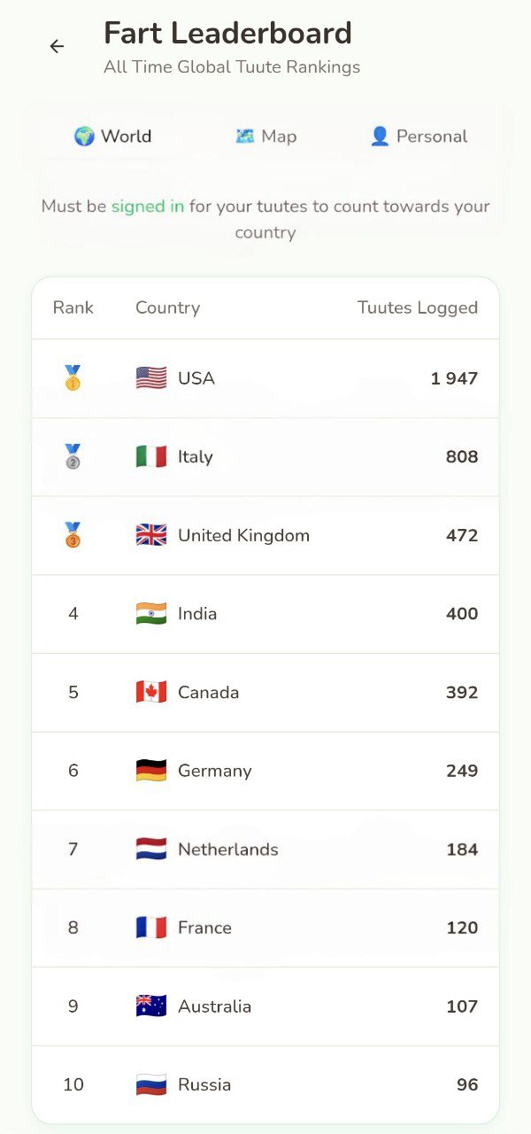 На сайте уже зарегистрировано более 8000 записей из более чем 100 стран. Есть таблица лидеров, где пользователи соревнуются по объёму газов, с США на первом месте, а также интерактивная карта с «горячими точками» пердежного мира.