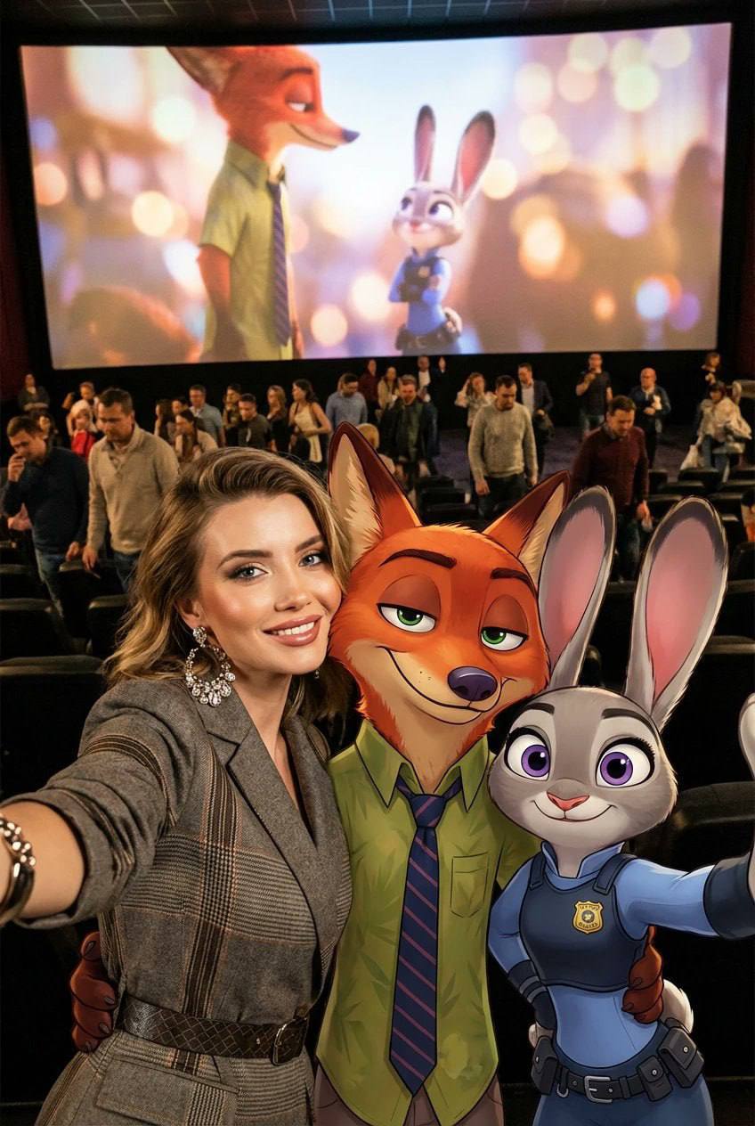 Фанаты «Зверополиса» наконец получили тот самый чит-код: теперь можно сделать реалистичное селфи с Ником Уайлдом и Джуди Хоппс буквально за пару секунд. Всё, что нужно — загрузить своё фото и вставить один промпт. Камера, свет, звёзды мультфильма — и вы будто только что сходили вместе на премьеру.