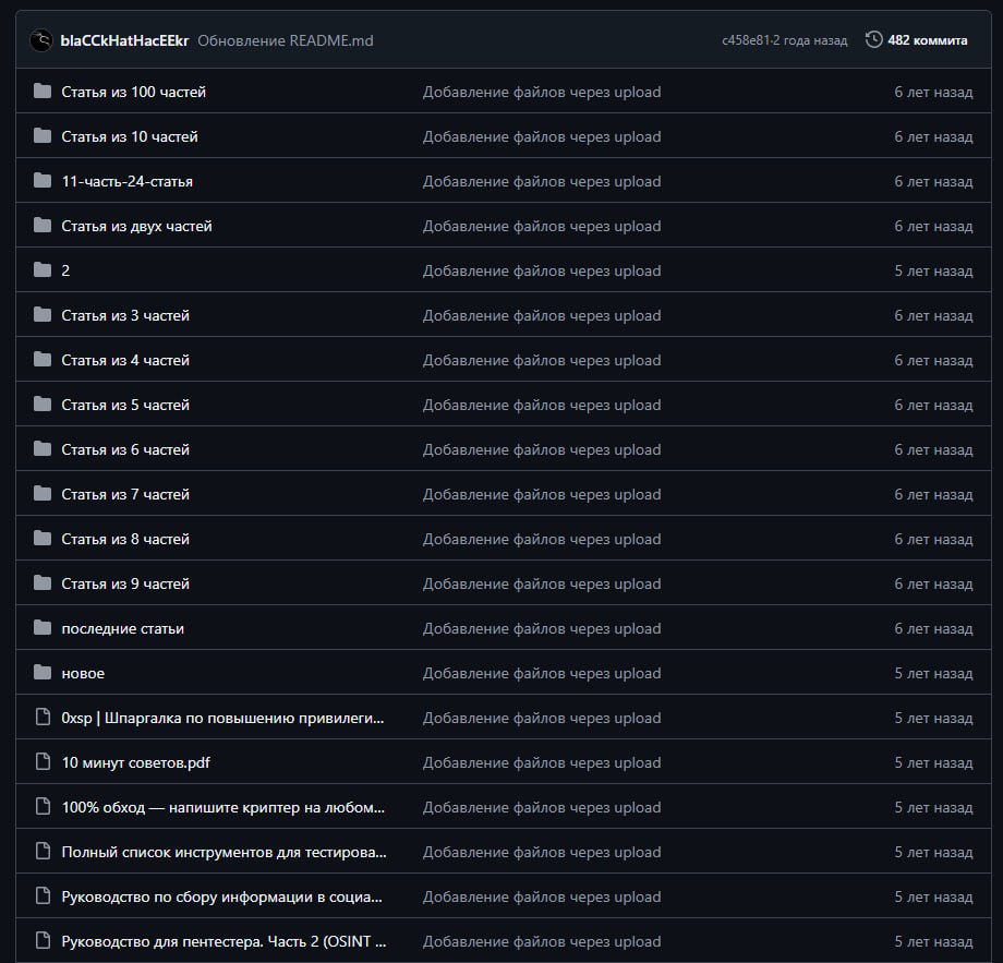 В этом репозитории на GitHub собрано множество статей и PDF-документов по таким темам, как пентест, red team, OSINT и многим другим. В коллекции вы найдете гайды, чек-листы, подборки инструментов и учебные материалы для разных уровней подготовки.